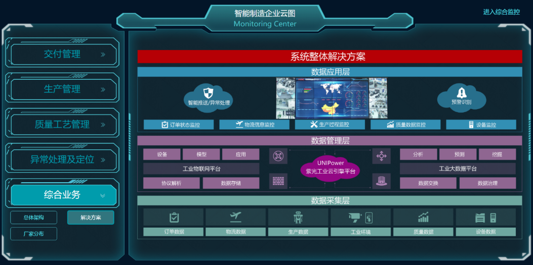 建立智能制造企業云圖,與現有業務系統集成,作為信息化,智能化的一個重要組成部分,負責公司各系統關鍵數據采集、匯總、分析處理,并以圖形化,虛擬加實景形態展現,以達到透明化管理、調度、控制、優化的目的。將有利于公司全價值鏈信息暢通,提高設備利用率和生產力,降低能耗,提升綜合競爭力。