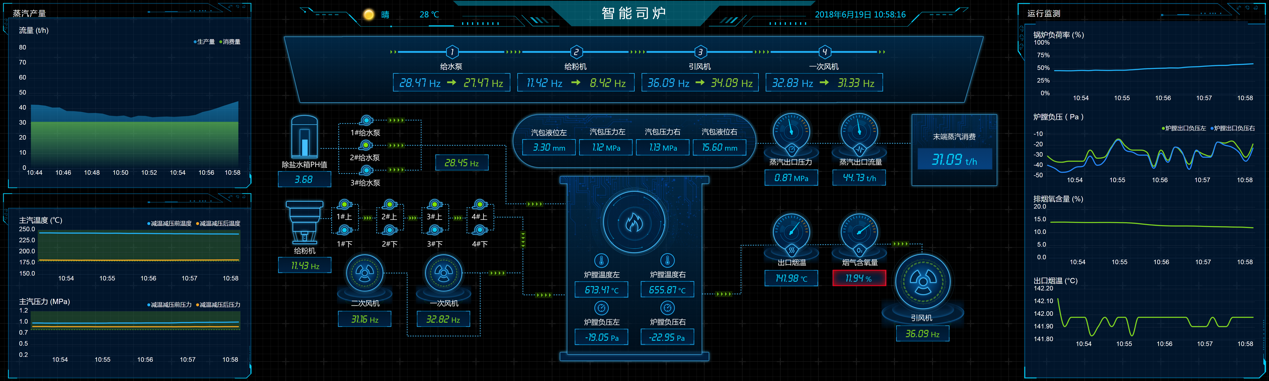 該APP基于熱能生產(chǎn)過程的全工藝過程數(shù)據(jù)建立熱能生產(chǎn)的數(shù)字孿生和數(shù)據(jù)模型,并基于模型實現(xiàn):智能司爐、生產(chǎn)監(jiān)控、管網(wǎng)平衡、設(shè)備管理、經(jīng)營分析。輔助司爐工、設(shè)備管理者、生產(chǎn)管理者等角色實現(xiàn)基于數(shù)據(jù)的個性化、最優(yōu)化司爐操作、設(shè)備維保和生產(chǎn)管理,實現(xiàn)安全事故降低80%、熱能生產(chǎn)效率提升30%、生產(chǎn)成本降低10%,輔助熱能生產(chǎn)進入智能化時代。如下圖是一個智能司爐界面,基于數(shù)據(jù)模型為一線司爐人員提供最優(yōu)化的鍋爐控制操作。