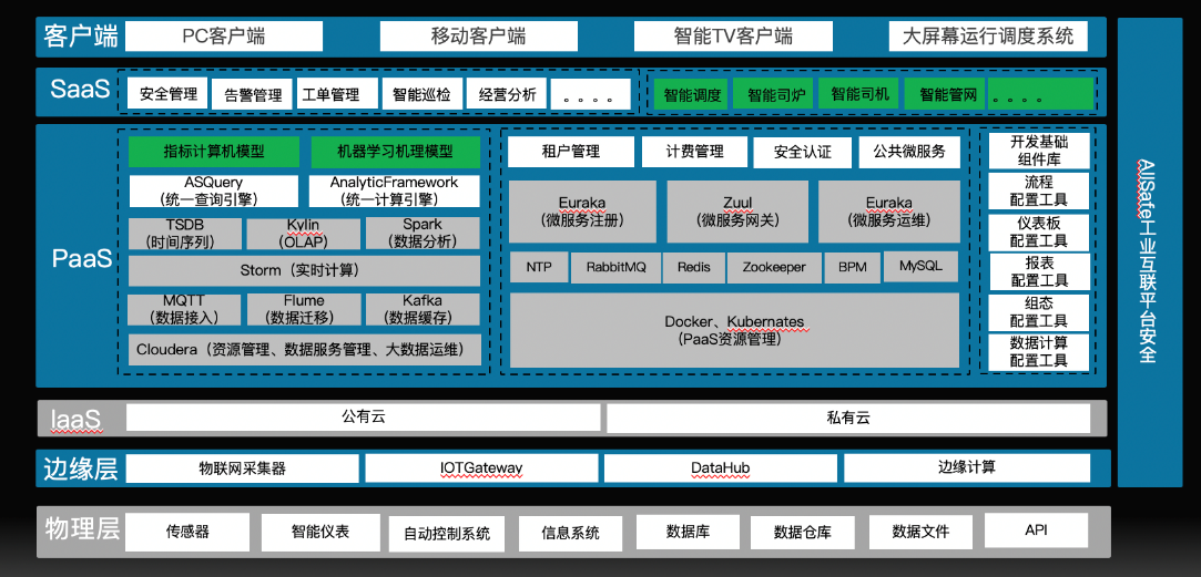 PaaS層:云端平臺(tái)層,提供了面向工業(yè)的工業(yè)大數(shù)據(jù)、工業(yè)微服務(wù)和交付工具等。該層是工業(yè)互聯(lián)網(wǎng)的核心層,其中工業(yè)大數(shù)據(jù)提供了面向工業(yè)的時(shí)間序列數(shù)據(jù)引擎、實(shí)時(shí)計(jì)算數(shù)據(jù)引擎、數(shù)據(jù)緩存引擎、數(shù)據(jù)檢索引擎等。工業(yè)微服務(wù)提供了基于容器化管理的各種基礎(chǔ)服務(wù)和各種微服務(wù)管理引擎等。面向熱能生產(chǎn),該層提供了面向熱能生產(chǎn)的數(shù)據(jù)治理、數(shù)據(jù)預(yù)處理組件、數(shù)據(jù)分析組件,以及面向熱能生產(chǎn)的公共微服務(wù)。在開(kāi)發(fā)工具部分,提供了面向熱能生產(chǎn)的組態(tài)工具、報(bào)表工具等。