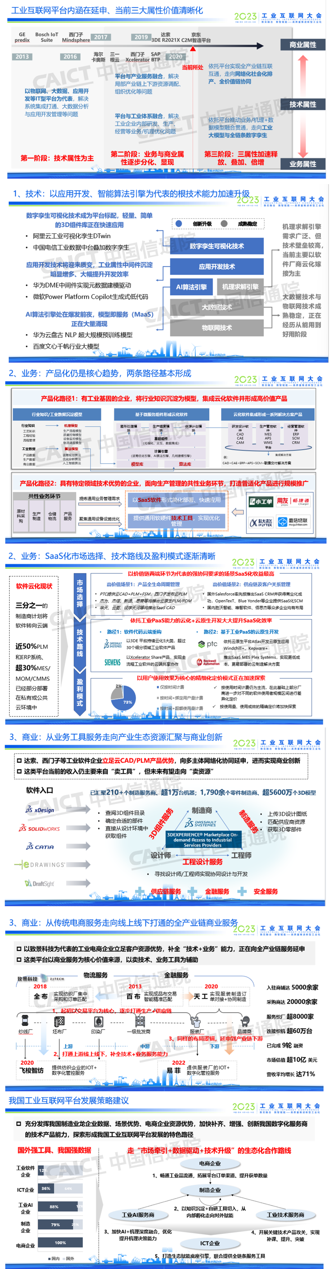 6月15日,2023工業(yè)互聯(lián)網(wǎng)大會(huì)在蘇州舉行,在“工業(yè)互聯(lián)網(wǎng)創(chuàng)新發(fā)展”論壇上,中國信息通信研究院信息化與工業(yè)化融合研究所工業(yè)互聯(lián)網(wǎng)技術(shù)產(chǎn)業(yè)創(chuàng)新研究部工程師侯羽菲指出,當(dāng)前工業(yè)互聯(lián)網(wǎng)平臺(tái)正在由單一技術(shù)屬性向技術(shù)、業(yè)務(wù)與商業(yè)三大屬性相互疊加演進(jìn)。在技術(shù)層面,數(shù)字孿生可視化、應(yīng)用開發(fā)和人工智能算法引擎三大“根”技術(shù)創(chuàng)新加速;在業(yè)務(wù)層面,產(chǎn)品化與SaaS化是釋放平臺(tái)業(yè)務(wù)賦能價(jià)值的核心;在商業(yè)層面,“工具+資源”服務(wù)為平臺(tái)商業(yè)創(chuàng)新提供新機(jī)遇。