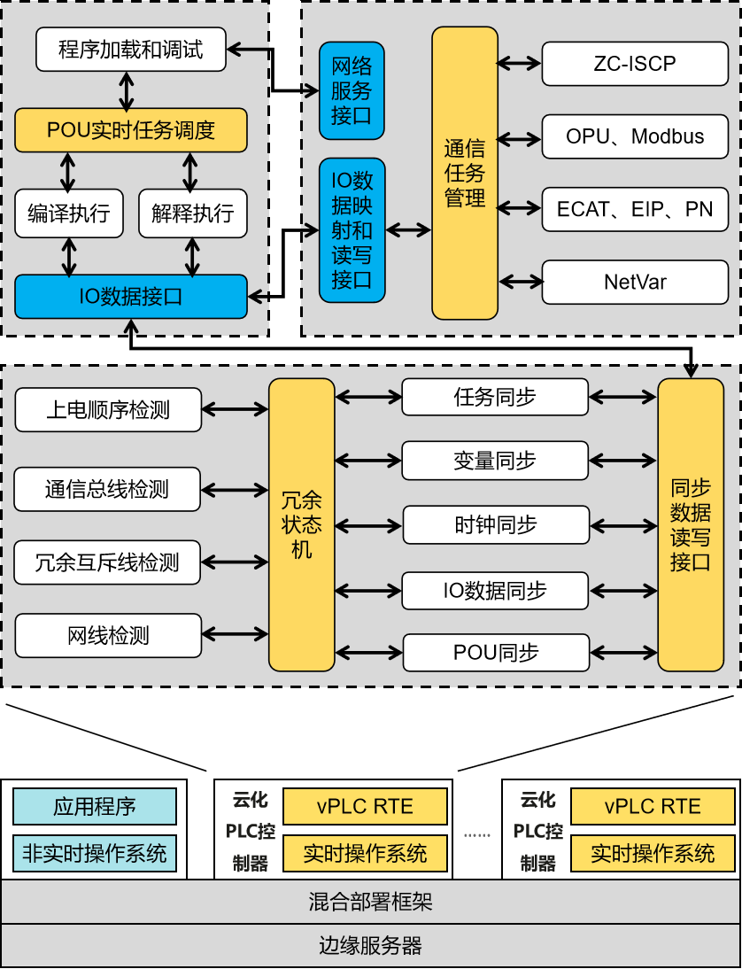 (2)多協議通信管理:基于私有通信協議ZC-ISCP的IDE-RTE交互技術;OPC UA/DA和Modbus TCP/RTU等數采通信協議;EtherCAT、EtherNet/IP、Profinet等工業以太網總線協議;vPLC間的網絡變量NetVar通信協議。