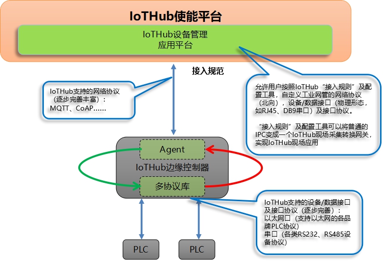 IoTHub邊緣控制器是IT和OT之間的物理接口,實現(xiàn)工業(yè)互聯(lián)網(wǎng)應用的南向與北向“互聯(lián)互通”。IoTHub邊緣控制器產(chǎn)品(圖3)包括IoTHub Agent邊緣采集網(wǎng)關、工控機等。結合不同的采集、處理及存儲需求,邊緣控制涵蓋ARM架構、X86架構的處理器,支持Linux及Windows操作系統(tǒng),結合工業(yè)現(xiàn)場典型的數(shù)據(jù)接口類型,典型的南向物理接口包括RJ45(LAN)、RS232、RS485、GPIO等接口,支持主流的PLC協(xié)議及數(shù)控協(xié)議,用于連接邊緣層設備。北向提供RJ45(WAN)、4G、WiFi等網(wǎng)絡接口,支持標準TCP/IP、MQTT等網(wǎng)絡協(xié)議,用于連接工業(yè)互聯(lián)網(wǎng)平臺或工業(yè)互聯(lián)網(wǎng)賦能平臺(圖4),完成IT與OT的物理融合。