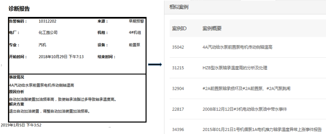 南京化學工業(yè)園熱電有限公司2018年10月29日從預警系統(tǒng)推送至診斷系統(tǒng)一條告警信息:“前置泵電機軸承溫度高”,診斷系統(tǒng)根據(jù)告警信息推薦的案例中詳細介紹了前置泵電機軸承溫度高的主要原因與處理方法,用戶參考推薦案例,判斷軸承溫度高的原因為潤滑油過量,通過調整自動加油裝置的加油頻率解決了該問題,而這一案例也作為新的案例進入了知識庫,當該問題再次發(fā)生時,診斷系統(tǒng)會立即推送該案例給用戶,起到知識傳承的作用,診斷過程參見圖16。