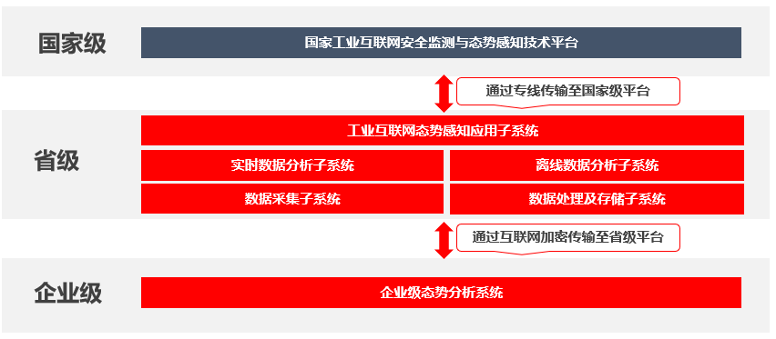 面向省級(jí)的工業(yè)互聯(lián)網(wǎng)安全監(jiān)測(cè)與態(tài)勢(shì)感知系統(tǒng)是構(gòu)建全方位的工業(yè)互聯(lián)網(wǎng)安全綜合保障網(wǎng)絡(luò)體系的重要基礎(chǔ)。通過打造企業(yè)內(nèi)部工業(yè)互聯(lián)網(wǎng)態(tài)勢(shì)感知系統(tǒng),完成態(tài)勢(shì)的細(xì)粒度分析,并將態(tài)勢(shì)感知系統(tǒng)與省級(jí)工業(yè)互聯(lián)網(wǎng)安全監(jiān)測(cè)與態(tài)勢(shì)感知系統(tǒng)聯(lián)動(dòng),實(shí)現(xiàn)省級(jí)工業(yè)互聯(lián)網(wǎng)安全全面及實(shí)時(shí)的監(jiān)測(cè)。