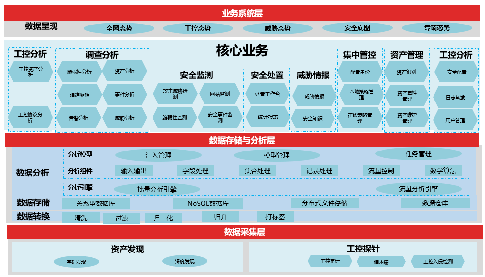 構(gòu)建企業(yè)級(jí)態(tài)勢(shì)分析系統(tǒng),圍繞企業(yè)內(nèi)部工業(yè)網(wǎng)絡(luò)數(shù)據(jù),構(gòu)建態(tài)勢(shì)應(yīng)用包括態(tài)勢(shì)感知數(shù)據(jù)交互式檢索、工控?cái)?shù)據(jù)實(shí)時(shí)監(jiān)測(cè)、態(tài)勢(shì)分析模型、安全風(fēng)險(xiǎn)快速處置、工業(yè)安全問題追蹤溯源等功能。