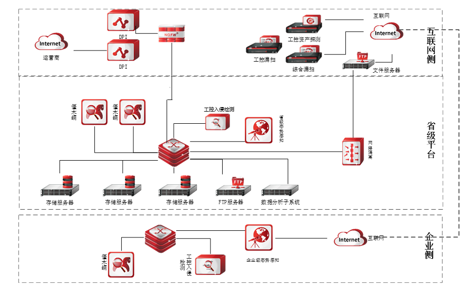 本項(xiàng)目主要是在互聯(lián)網(wǎng)側(cè)、省級(jí)平臺(tái)和企業(yè)側(cè)實(shí)施的部署:在互聯(lián)網(wǎng)區(qū)(運(yùn)營(yíng)商)部署漏掃產(chǎn)品,通過網(wǎng)絡(luò)隔離設(shè)備導(dǎo)入內(nèi)網(wǎng)FTP服務(wù)器,再接入省級(jí)平臺(tái),向省級(jí)平臺(tái)傳輸監(jiān)測(cè)數(shù)據(jù),部署DPI流量分析設(shè)備,可為工控入侵檢測(cè)提供原始工控流量,為僵木蠕提供全網(wǎng)抽樣流量;省級(jí)的態(tài)勢(shì)感知平臺(tái)部署在核心區(qū),通過對(duì)接收的企業(yè)側(cè)和互聯(lián)網(wǎng)側(cè)的檢測(cè)數(shù)據(jù)進(jìn)行綜合分析,實(shí)現(xiàn)省級(jí)工業(yè)互聯(lián)網(wǎng)安全全面及實(shí)時(shí)的監(jiān)測(cè);在某省企業(yè)區(qū)域部署企業(yè)級(jí)的態(tài)勢(shì)分析系統(tǒng)及僵木蠕、工控審計(jì)等探針,向省級(jí)態(tài)勢(shì)感知平臺(tái)提供監(jiān)測(cè)數(shù)據(jù)。