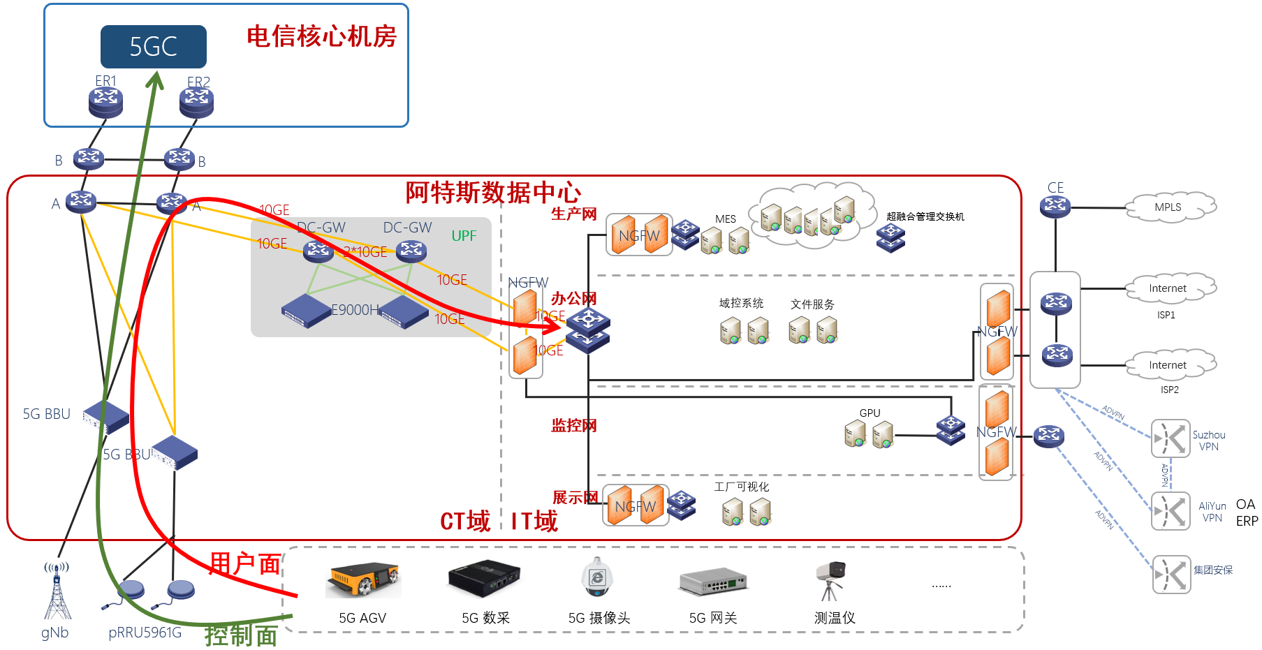 根據(jù)5G核心網(wǎng)控制面和用戶面分離的特點,將用戶面UPF下沉到阿特斯數(shù)據(jù)中心實現(xiàn)數(shù)據(jù)本地分流,保障企業(yè)核心數(shù)據(jù)安全,并進一步降低網(wǎng)絡時延,提升核心業(yè)務性能與體驗。