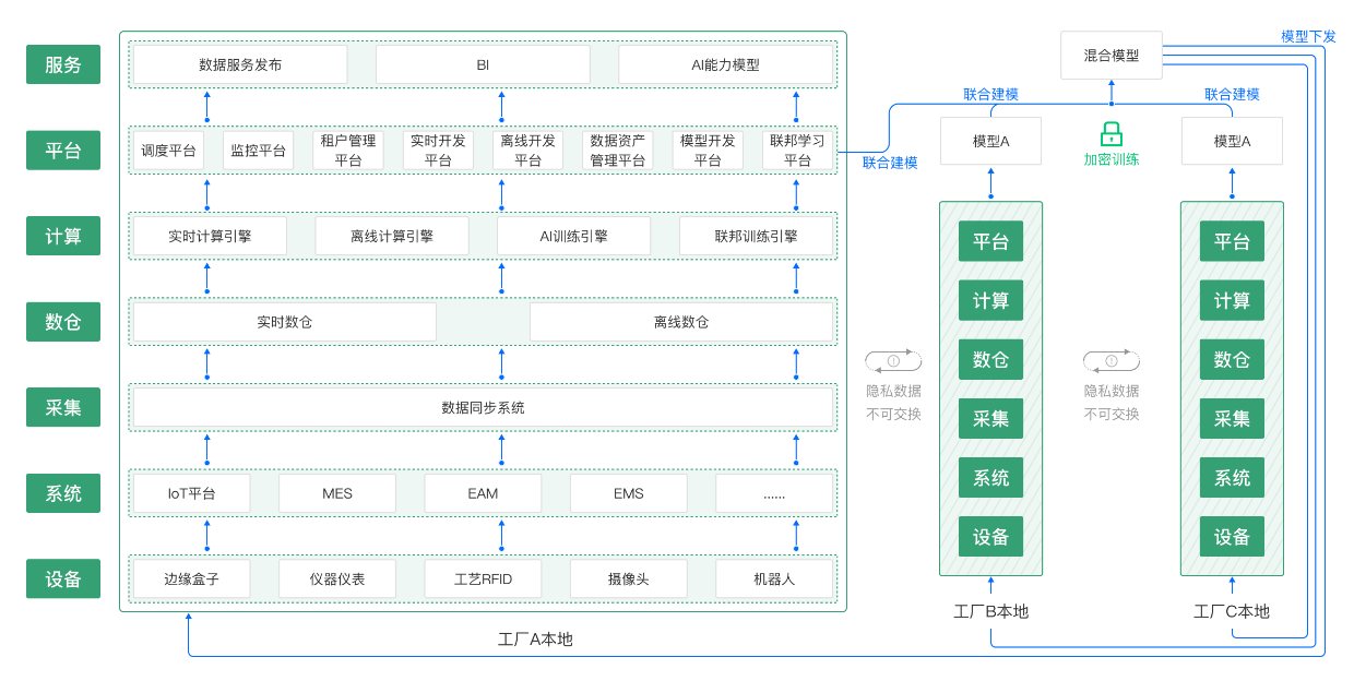 本項目總體框架可概括為“1個工業互聯網數字化底座+7個工業應用+1套卓越運營轉型方法論”。廣域銘島為百礦集團搭建起一個工業互聯網平臺,并以平臺為基礎實現企業設備及能源上云,在產業鏈數據可視的前提下,在火力發電、電解鋁、通用動力等方面研發各類能源優化算法模型,并形成若干工業應用,提供智能決策優化路徑,降低對工藝專家知識的依賴,提供“專家賦能,數據驅動”為特征的工廠綠色低碳解決方案。如下圖所示: