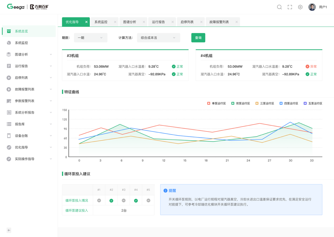 提供風機、空壓機、循環水等通用動力設備管理。風機優化通過建立布袋、煙道入口、煙道出口、風機、脫硫塔的設備模型,對參數實時監控,自動優化風機的開啟臺數、運行頻率,達到運行效率最大化。空壓機優化涵蓋供需平衡、空壓機設備效率提升兩部分:供需平衡通過IIOT平臺實時采集空壓機出口、用能端入口(電解槽、陽極車間、打料罐)、壓縮空氣管路的壓力、流量信息,結合算法模型,輸出推薦的壓縮空氣供氣壓力設備效率提升是建立空壓機、干燥機設備模型,在給定壓縮空氣需求下,合理分配設備開關、設備頻率,以達成以最少的電耗滿足用氣需求。循環水系統是用于現場設備、產品降溫的系統,主要由換熱器、管道、循環泵組成。循環水優化通過監控用能端的實時溫度與流量信息,結合工藝要求計量模型優化,實現循環泵的開關與頻率調整,反饋到制冷機設備,調整設備運行效率,達到制冷效率最大化降低能耗。