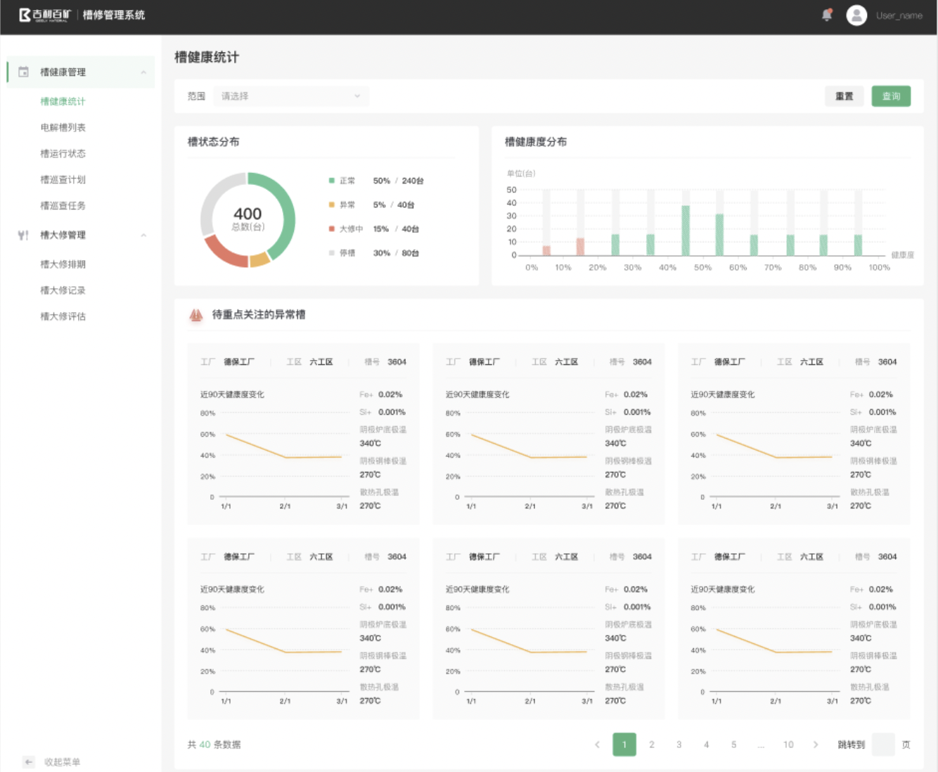 槽修管理:基于IIOT平臺采集槽狀態歷史數據在工廠、工區、單槽的維度對槽狀態進行分析預測持續跟蹤模擬槽狀態,提前對異常進行預警