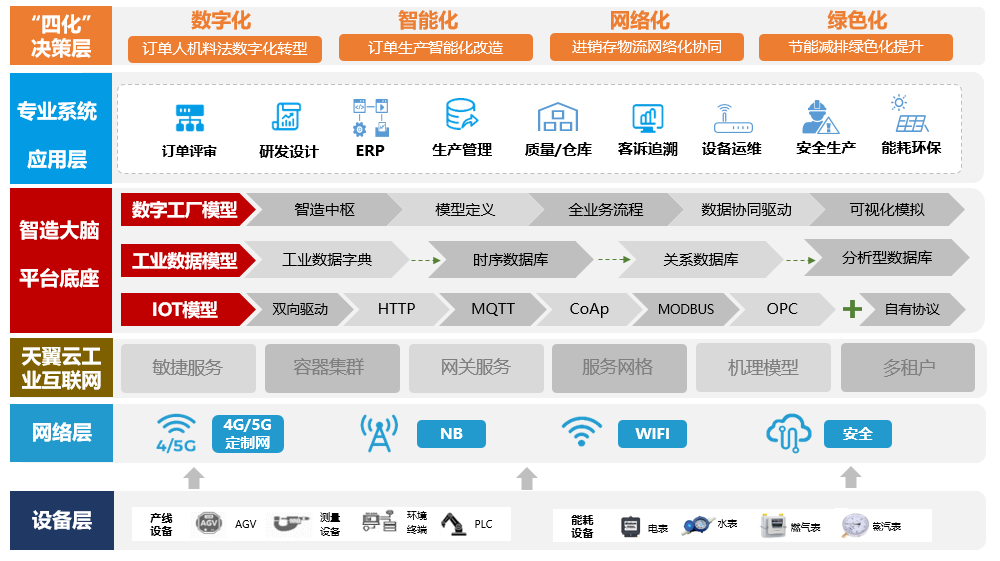 智造大腦平臺包含三個子系統工業制造模型、設備聯網模型、工業大數據模型,以5G網絡為底座打造全連接工廠,將研發、生產、倉儲、銷售等業務環節實現要素數字化,通過5G全流程數字化運營智造平臺統一接入各業務系統,數據匯集,可視化展示。