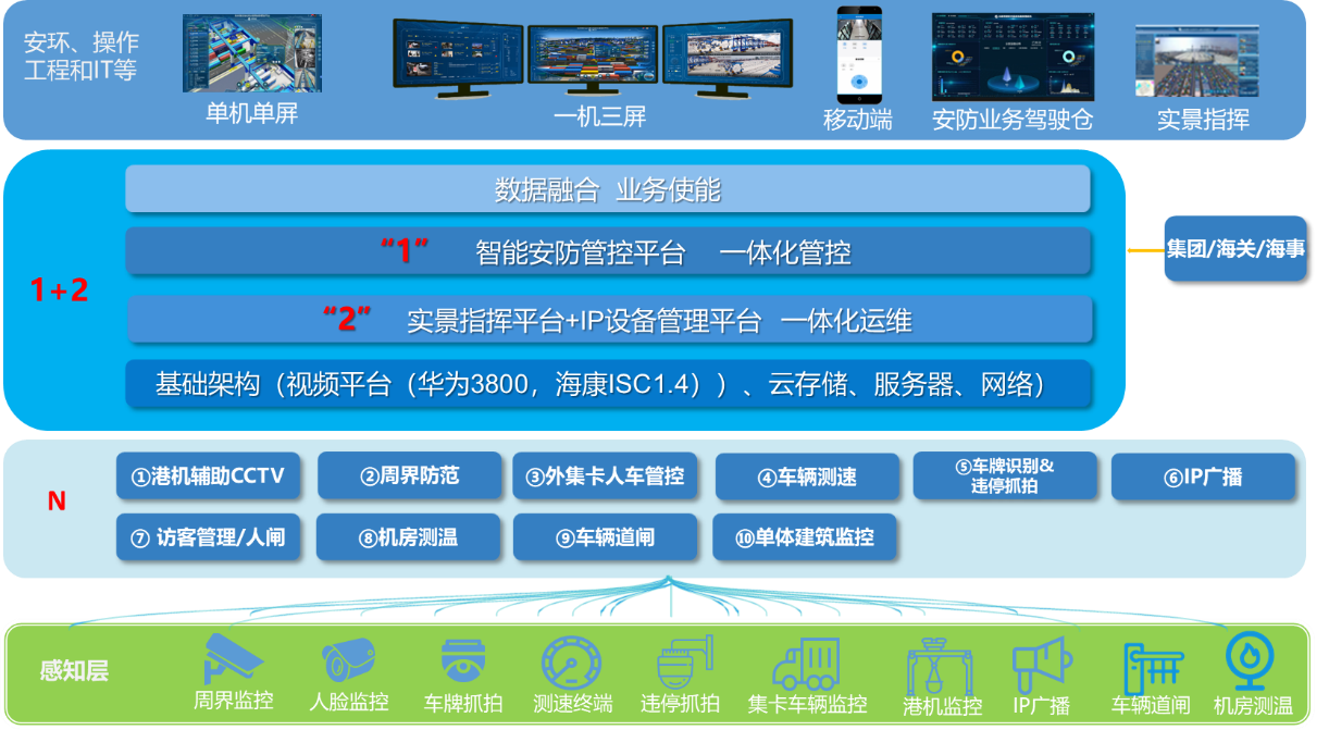 :該層次對應著碼頭的八種應用場景,包括堆場(U型通道)、輔建區、單體建筑、港機、周界、道路、閘口、停車場等。在每個場景中部署相應的安防設備和系統,以實現對該場景的監控和安全防范。
