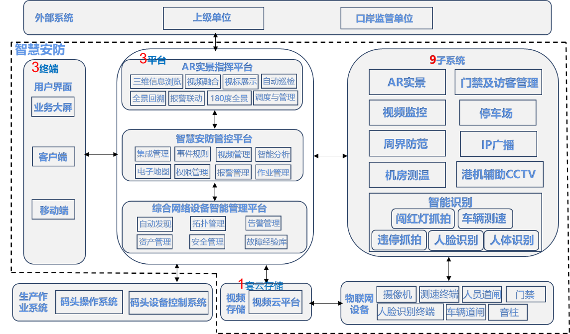 3、子系統:“N”個子系統包括AR實景、視頻監控、周界防范、門禁及訪客管理、智能識別(闖紅燈抓拍、車輛測速、違停抓拍、人臉識別、人體識別)、停車場、IP廣播、機房測溫、港機輔助CCTV等。每個子系統都具有特定的功能和任務,用于監控和管理碼頭的各個方面。