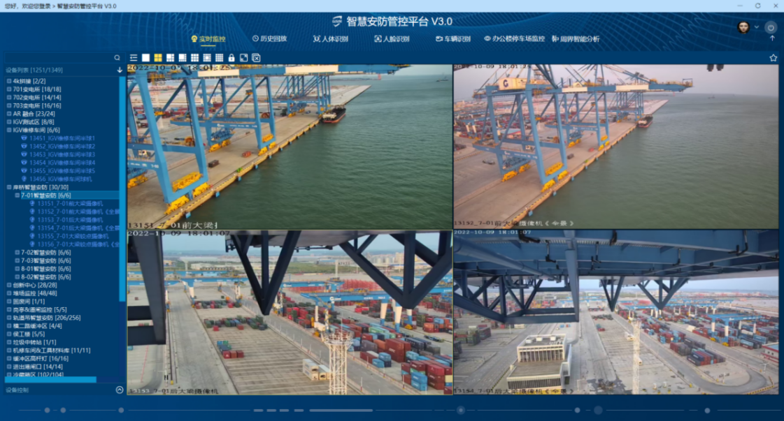 整合生產、安防兩張網中的視頻監控平臺,給安監部、操作部在一個客戶端上對安防資源進行統一管控,AI 人體、安全帽、港機定位、司機行為分析等功能。