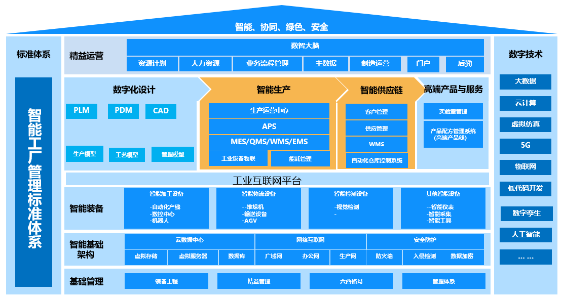 以智能、協同、綠色、安全的建設目標為出發點,本項目重點實現生產制造過程的智能化,智造全流程全要素數字化,總部與基地協同制造,安全及綠色用能管理,打造全連接智能工廠,未來綜合研發能力、工程能力、營銷能力、供應鏈能力提升,實現智能工廠戰略目標。