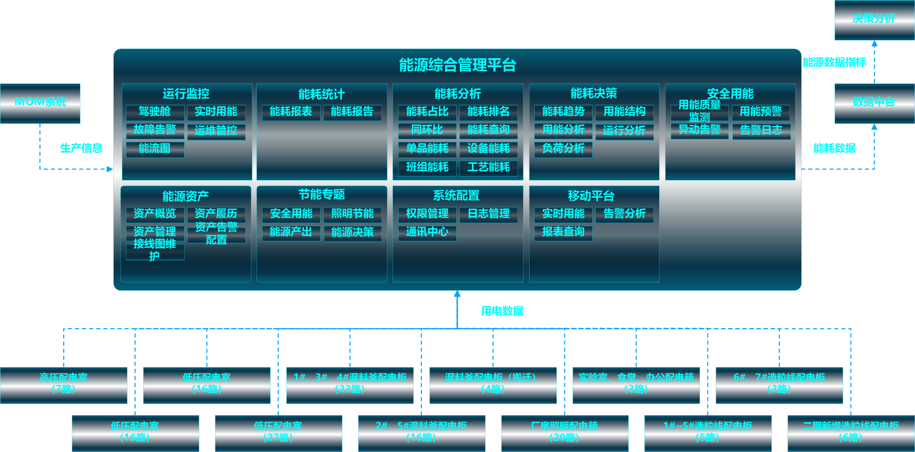 (五)要建立全面的能源綜合管理平臺,開辟綠色可持續制造發展之路,全面管控生產用能及輔助用能,優化用能結構,滿足國家碳排放相關政策,平臺要有不同基地間的擴展功能,后續形成以集團總部為監控中心各基地能源管控全覆蓋的持續用能優化迭代系統。
