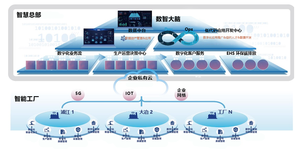 整個方案采用“智慧總部+智能工廠”架構,包括集團總部側和生產基地側,其中: