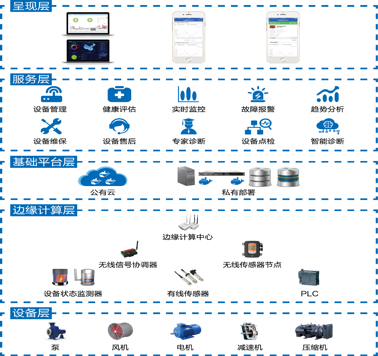 系統(tǒng)主要由設備層、邊緣計算層(含傳感檢測、數(shù)據(jù)采集、數(shù)據(jù)傳輸、邊緣計算)、基礎平臺層、服務層及客戶端呈現(xiàn)操作層組成。系統(tǒng)包括狀態(tài)傳感器、網絡協(xié)調器(或PLC、DCS控制器)、遠程智能傳輸單元、遠程服務器、服務系統(tǒng)、遠程PC客戶端及移動客戶端。