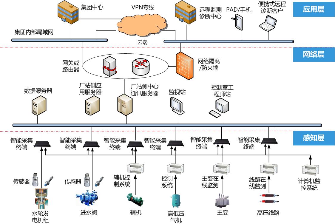 本解決方案包含在電站各發電設備上部署傳感器、采集處理設備,在電站部署數據挖掘、數據治理軟件,以及在發電集團公司的工業云平臺(私有云)上部署監測、預警、故障診斷等各類應用。對應于工業互聯網網絡體系架構,涉及以下多個位置: