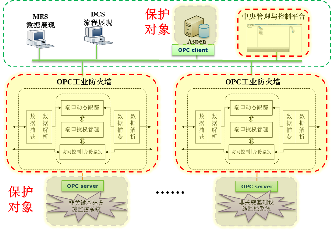 新興鑄管廠的OPC工業防火墻安全防護的總體架構如圖所示,OPC工業防火墻保護每個控制系統區域,部署在控制系統區域出口,進行區域隔離,避免病毒擴散,對OPC協議進行解析、動態端口管理、完整性檢查等,避免病毒攻擊。安全管控平臺為統一的集中管理OPC工業防火墻,部署在同Aspen數據庫同一層,對整個工業智能控制網絡進行實時監控,對報警及消息日志進行歷史存儲與分析。