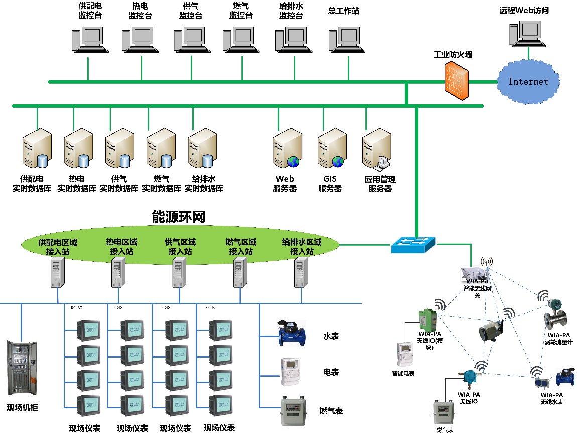 ? 工廠部署WIA-PA網絡,實現廠內標準化工業物聯網全覆蓋,用于現場能源儀表數據的全面采集。