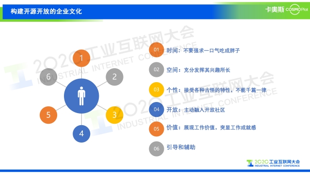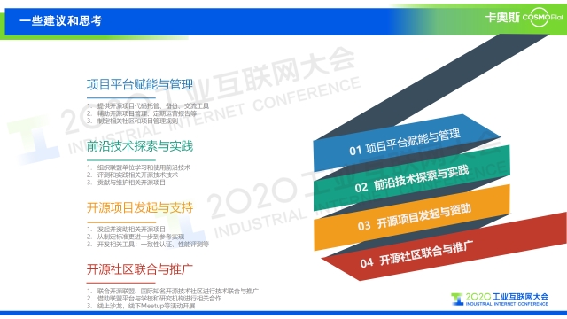 “給大家一些在開源領域層面的建議和思考。第一,項目平臺實現賦能與管理,要提供開源項目代碼托管、備份、交流的工具,通過一些工具來完善并且促進我們開源項目的管理。第二,輔助開源項目管理,要定期關注運營報告,同時要制定社區和整個項目的管理規則。第三,發起開源項目,支持開源項目,要從制定標準、開發工具,一致性認證、性能測評等等方面來推進。最后,開源社區的聯合與推廣,要做到產學研各個層面的聯合。開源不僅僅是源碼的開源,更重要的是我們要做到生態的建設。只有這樣,才能實現開源的真正推廣與落地。