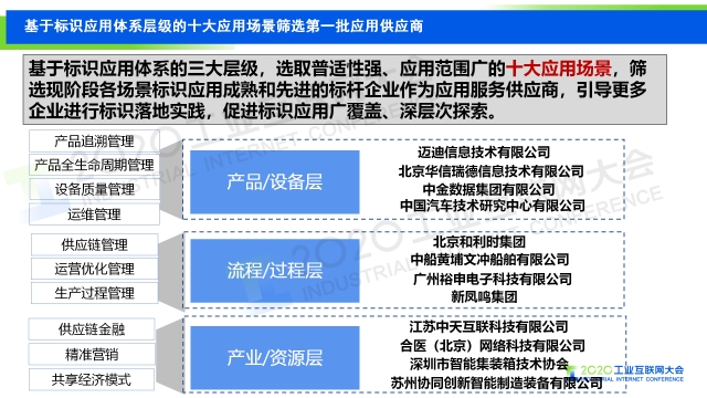 我國工業互聯網標識解析體系正逐步完善,標識應用初具規模。當前,中國信息通信研究院按照標識應用對象的不同層級構建工業互聯網標識應用體系,分析應用價值,能夠引導標識應用向更廣范圍、更大規模、更深層次發展。 中國信息通信研究院正在建立標識應用供應商體系,發揮各供應商應用基礎和優勢,為標識規模化落地提供便捷條件,將從三個方面助力企業快速落地標識應用。一是豐富標識應用體系,形成標識應用產品庫和資源池,不斷完善標識應用體系,提供一體化、多樣化選擇; 二是引導企業快速落地應用,解決企業標識應用落地難,成效差的問題,降低企業對于應用開發的門檻,實現應用快速規模化落地; 三是形成標識應用產業風向標,發揮行業龍頭的優勢和經驗積累,通過行業強實踐性應用,挖掘標識潛在深層價值,明確應用發力點和突破方向,為標識產業決策做支撐。 詳情見以下演講PPT 敬請閱讀 本次發布的工業互聯網標識應用供應商將提供應用產品方案規劃、應用方案設計、應用所需資源測算,標識應用技術支持、系統對接、軟硬件適配,標識應用運營計劃,標識解析應用建議、運營形式、成本審視及規劃等服務。 未來,中國信通院工業互聯網所將與合作伙伴共同構建工業互聯網標識生態,支持標識應用供應商成為綜合解決方案提供商,不斷壯大、完善標識供應商體系。