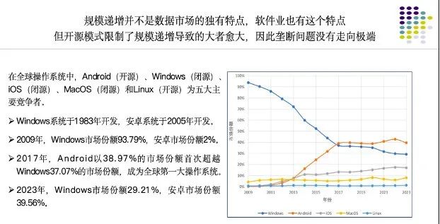 看待數據市場,需要研究市場的規則、行為和結構,特別是 AI 出現以后的“小規模企業+巨大市場”是非常具有挑戰的問題,對規模遞增下的競爭和壟斷的分析也是我們的一個困惑。我們不能簡單地認為市場從長期看會解決這個問題的,然后完全交給市場去處理。規模遞增并不是數據市場的獨有特點,軟件業也有這個特點,但開源模式限制了規模遞增導致的大者愈大,因此壟斷問題沒有走向極端。雖然領先者有規模遞增的能力,但是開源之后,更多的開發者和應用市場出現,目前沒有導致規模遞增一定會致使大者越大、強者越強的局面出現。