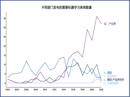 如下圖,2014 年是一個轉折點,AI 系統不是高校研發后的產業轉化,而是從最基本的數學算法開始,都由產業界來做,2023 年 32 個重要的機器學習模型都誕生在產業界。我們現在也經常講國家創新體系,集中力量辦大事,這方面也要考慮到數字時代的這種產業創新范式變革。這種海量的算力、數據以及人才迅速決策的能力、技術迭代的速度,完全是另外一種創新的組織架構,其中的變化是非常重要的。