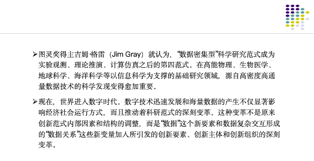 數據產業鏈條中,各環節參與方的行為和以往不一樣,這個方面要研究的新問題很多。因為最近我在做一項數字時代創新問題研究,就拿它舉例。現在數據創新范式按照國內外的很多學者來說,進入了“數據密集型”的科研創新范式。我們能看到除了數字行業自身以外,生物醫學、高能物理、地球科學、海洋科學很多都是以信息科學為支撐的基礎研究領域,如果數據觀測處理能力不高,它們的進展是非常困難的。生命科學中,蛋白質怎么預測出來,不是生命科學自身的原創性發現,而是數字技術應用帶來的結果,其中的原理早就知道,但就是算不出來。現在,世界進入數字時代,數字技術迅速發展和海量數據的產生不僅顯著影響經濟社會運行方式,而且推動著科研范式的深刻變革。這種變革不是原來創新范式內部因素和結構的調整,而是“數據”這個新要素和數據復雜交互形成的“數據關系”這些新變量加入所引發的創新要素、創新主體和創新組織的深刻變革