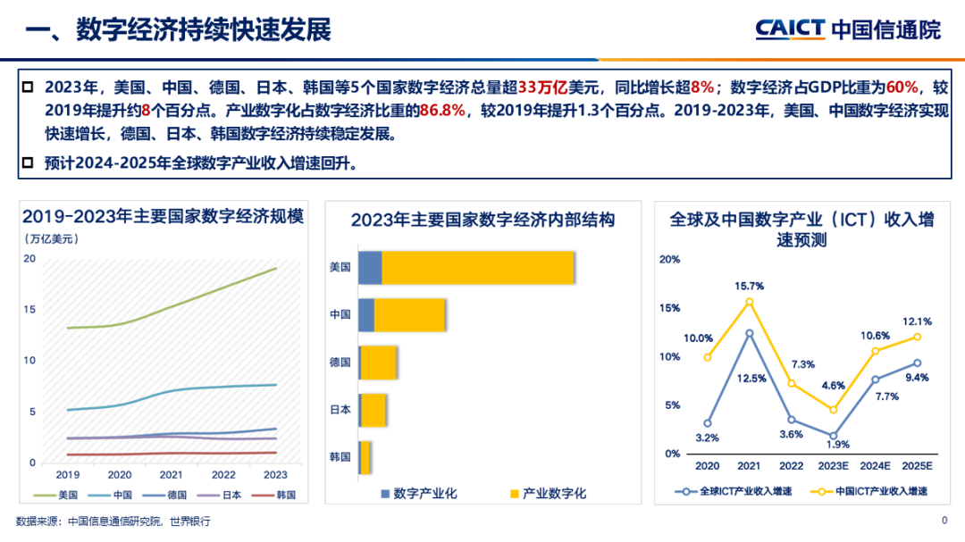 主要國家數(shù)字經(jīng)濟持續(xù)快速發(fā)展。總體看,2023年,美國、中國、德國、日本、韓國等5個國家數(shù)字經(jīng)濟總量超33萬億美元,同比增長超8%;數(shù)字經(jīng)濟占GDP比重為60%,較2019年提升約8個百分點。2019-2023年,德國、日本、韓國數(shù)字經(jīng)濟穩(wěn)定發(fā)展,美國、中國數(shù)字經(jīng)濟實現(xiàn)快速增長。內(nèi)部結構看,產(chǎn)業(yè)數(shù)字化對數(shù)字經(jīng)濟增長的引擎作用持續(xù)發(fā)揮,2023年占數(shù)字經(jīng)濟比重達86.8%,較2019年提升1.3個百分點;預計2024-2025年,全球數(shù)字產(chǎn)業(yè)收入增速回升,穩(wěn)步夯實數(shù)字經(jīng)濟發(fā)展基礎。