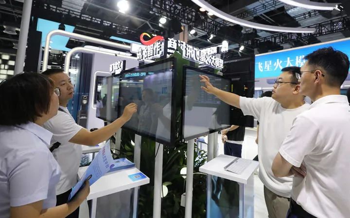 2024世界人工智能大會上,參觀者在訊飛星火大模型演示屏前體驗交流。新華社記者方喆 攝
