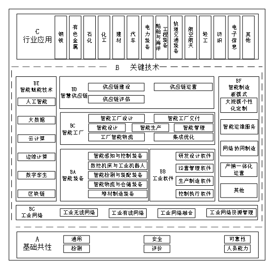 智能制造標準體系框架圖包含了智能制造標準體系的基本組成單元,具體包括A基礎共性、B關鍵技術、C行業應用等3個部分,如圖3所示。