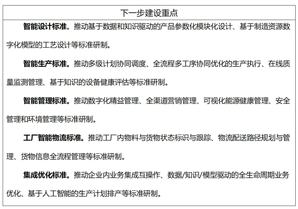 到2026年,制修訂100項以上國家標準、行業標準,構建適應新型工業化發展的智能制造標準體系。加快制定智能檢測、智能物流等智能裝備標準,研發設計、生產制造等工業軟件標準,智能設計、智能管理等智能工廠標準,供應鏈建設、供應鏈運營等智慧供應鏈標準,數字孿生裝備、人工智能工業應用、工業數據流通等智能賦能技術標準,網絡協同制造、產銷一體化運營等智能制造新模式標準,工業無線網絡、工業網絡融合等工業網絡標準,探索標準研制新方法,固化成功經驗和創新成果,形成典型場景系統解決方案標準,引導企業應用標準指導實踐,構建企業智能制造標準體系,推動智能制造高質量發展。