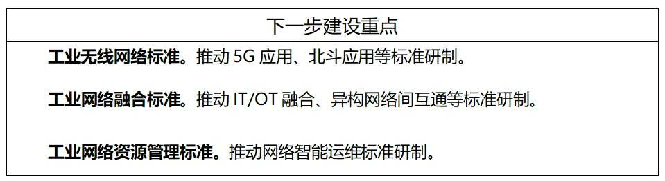 工業無線網絡標準主要包括無線局域網(WLAN)、無線可尋址遠程傳感器高速通道(WirelessHART)、用于工廠自動化/過程自動化的工業無線網絡(WIA-FA/PA)、窄帶物聯網(NB-IoT)、5G應用、北斗應用等標準。工業有線網絡標準主要包括現場總線、工業以太網、工業無源光纖網絡(xPON)、工業綜合布線、單對線以太網等標準。工業網絡融合標準主要包括確定性網絡(DetNet)、時間敏感網絡(TSN)、信息技術/運營技術(IT/OT)融合、異構網絡間互通、IPv6+、高可靠組網等標準。工業網絡資源管理標準主要包括網絡地址管理、網絡頻譜管理、網絡智能運維等標準。