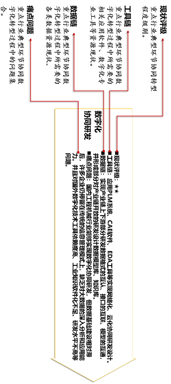 在行業(yè)場景圖譜中,每個場景由場景編號、場景名稱、場景現(xiàn)狀評級、場景轉(zhuǎn)型價值標簽、各類數(shù)字化要素及場景痛點等內(nèi)容組成,以標準化的方式對所有場景進行描述和表達。單一場景以工程機械行業(yè)“產(chǎn)品整體研發(fā)設(shè)計和仿真測試”場景為例(如圖2所示),跨業(yè)務(wù)協(xié)同場景以鋼鐵行業(yè)“數(shù)字化協(xié)同管理”場景為例(如圖3所示)。