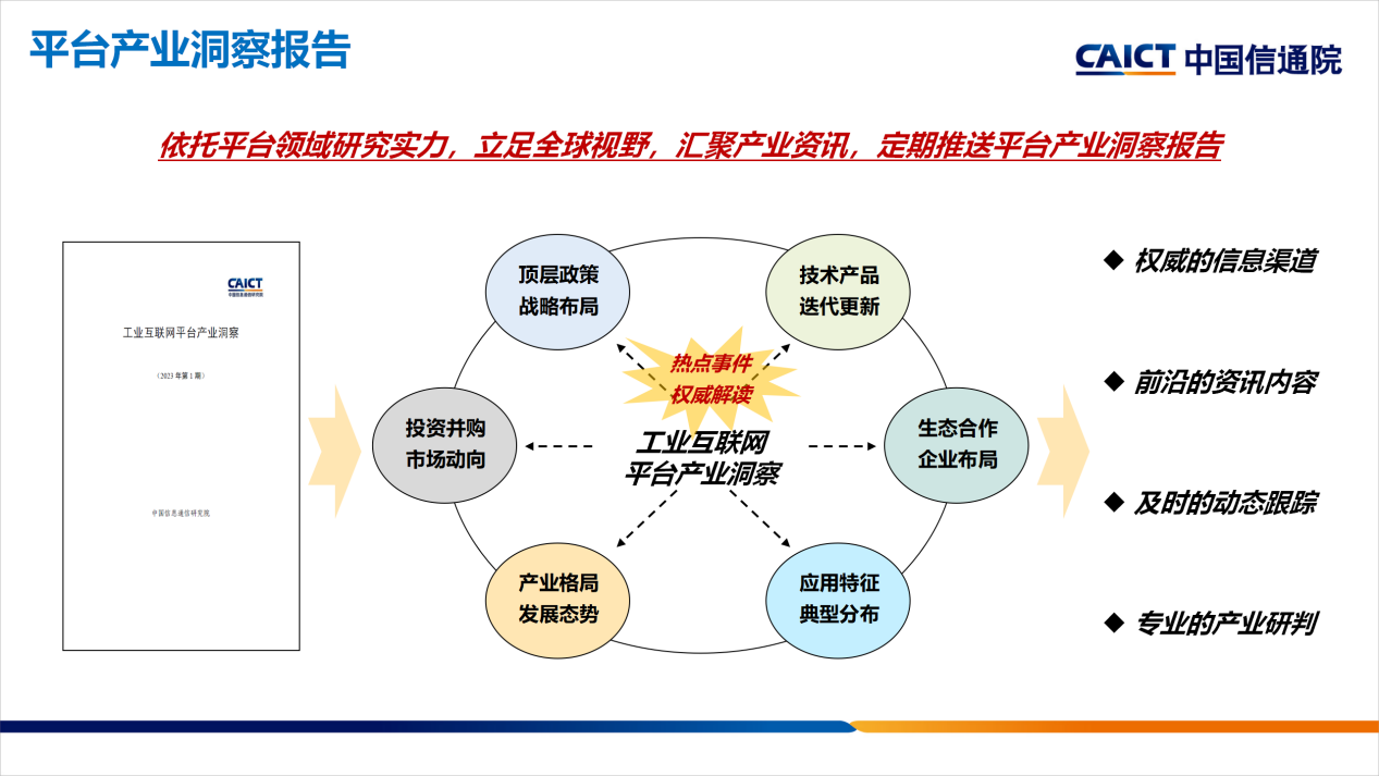 為進一步推動我國工業互聯網平臺產業研究,中國信通院聚合各方優勢資源,推出產業月度資訊報告-《工業互聯網平臺產業洞察》(以下簡稱報告),旨在提供高效、前沿的平臺資訊服務及客觀專業的點評。