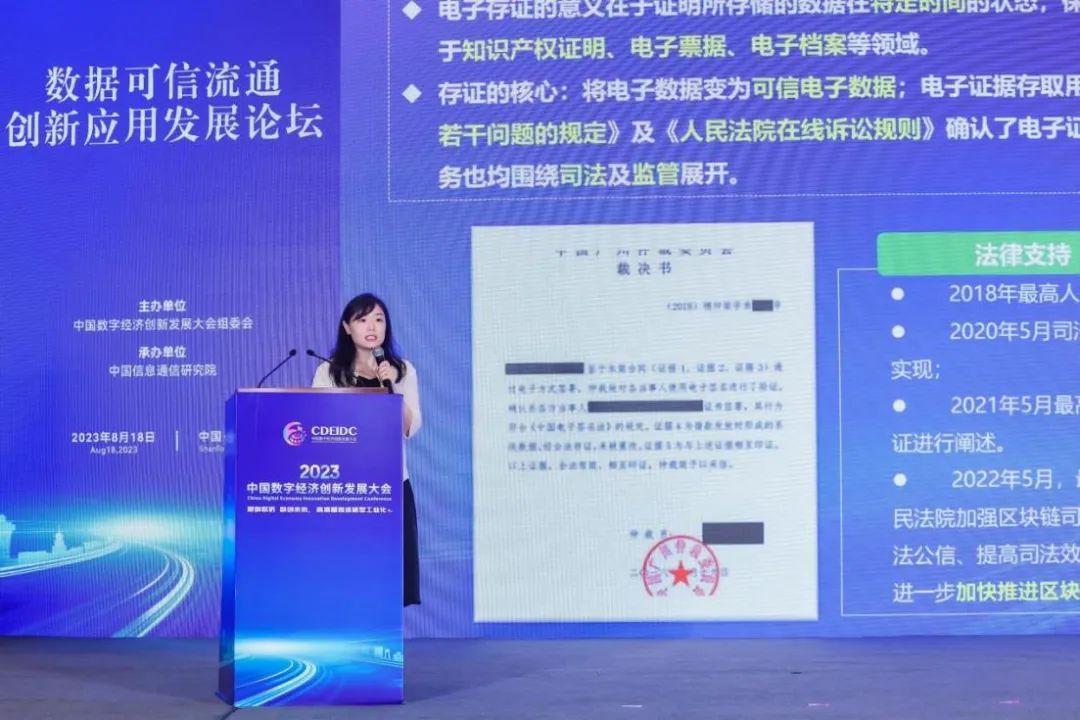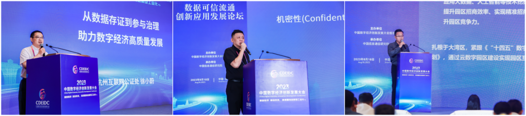主題分享環節,杭州市互聯網公證處主任徐小蔚以《從數據存證到參與治理,助力數字經濟高質量發展》為主題,分享了杭州互聯網公證處依托司法聯盟鏈實現在線取證,快速保存實時證據信息,輕松解決取證難題;數字政府粵東信創適配中心負責人陳端濤以《信創發展--基于數據可信安全的應用》,介紹了信創及可信安全常用的技術、方式及閑逛應用;集商網絡(上海)科技有限公司華南區總裁游文增以《可信數據存證在產業園區的應用》為題,分享了產業園區可信數據場景及解決方案。