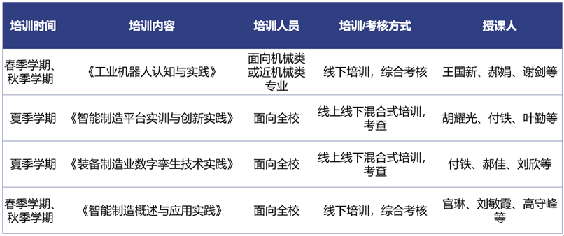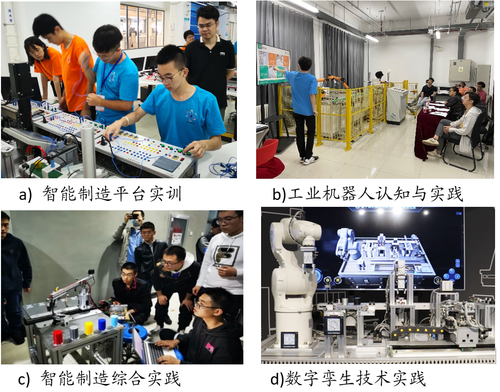 現(xiàn)有課程包括《工程訓(xùn)練》、《制造技術(shù)基礎(chǔ)訓(xùn)練》、《智能制造綜合實(shí)踐》、《工業(yè)機(jī)器人認(rèn)知與實(shí)踐》、《數(shù)字孿生技術(shù)實(shí)踐》、《智能制造平臺(tái)實(shí)訓(xùn)》以及《生產(chǎn)系統(tǒng)綜合設(shè)計(jì)與實(shí)驗(yàn)》等,從多個(gè)方向面向工業(yè)互聯(lián)網(wǎng)相關(guān)人才提供實(shí)踐能力、職業(yè)素養(yǎng)、創(chuàng)新精神等方面的綜合培養(yǎng),為培養(yǎng)適應(yīng)工業(yè)互聯(lián)網(wǎng)發(fā)展需要的高素質(zhì)、全面發(fā)展的產(chǎn)業(yè)人才提供良好實(shí)訓(xùn)條件??荚嚳己朔椒壳爸饕捎每疾榉绞?,以實(shí)踐任務(wù)完成情況為打分依據(jù),對(duì)學(xué)員進(jìn)行考核。