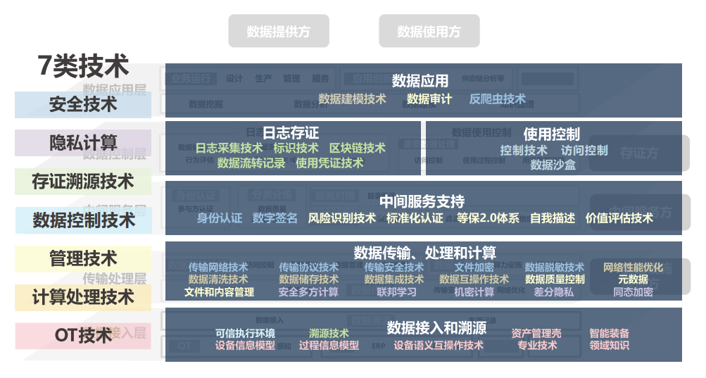 間的實(shí)現(xiàn)主要需要以下七大類技術(shù),包括安全技術(shù)、隱私計(jì)算技術(shù)、存證溯源技術(shù)、數(shù)據(jù)控制技術(shù)、管理技術(shù)、
