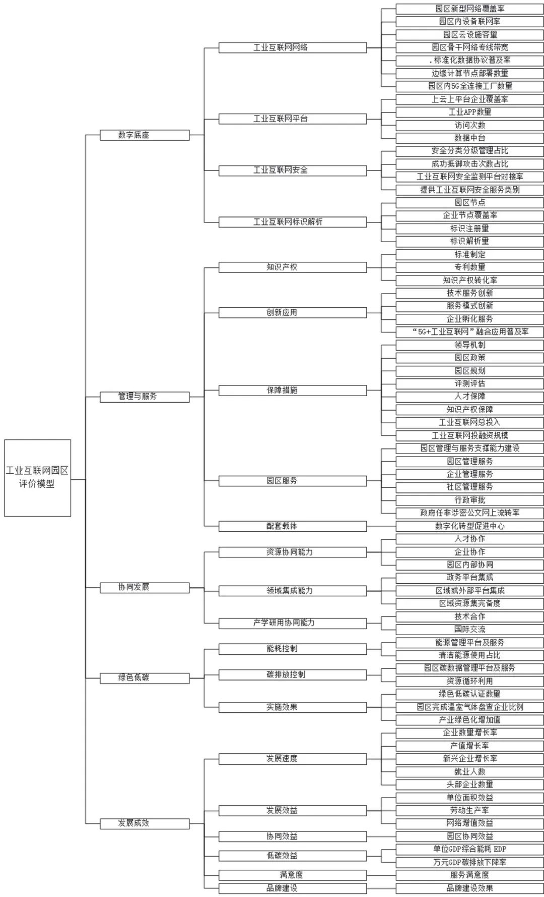 該標(biāo)準(zhǔn)以推動工業(yè)互聯(lián)網(wǎng)賦能園區(qū)為宗旨,綜合考慮園區(qū)、城市、產(chǎn)業(yè)等多維度協(xié)同效應(yīng),圍繞工業(yè)互聯(lián)網(wǎng)園區(qū)的規(guī)劃、建設(shè)、運營、轉(zhuǎn)型與發(fā)展,全面設(shè)定分級評價指標(biāo)。評價模型設(shè)置數(shù)字底座、管理與服務(wù)、協(xié)同發(fā)展、綠色低碳、發(fā)展成效等5項一級指標(biāo),工業(yè)互聯(lián)網(wǎng)網(wǎng)絡(luò)、工業(yè)互聯(lián)網(wǎng)標(biāo)識解析、創(chuàng)新應(yīng)用、保障措施、產(chǎn)學(xué)研用協(xié)同能力、質(zhì)量效益等21項二級指標(biāo),并對各項指標(biāo)進行科學(xué)合理地細化,形成69項三級指標(biāo)。標(biāo)準(zhǔn)按照工業(yè)互聯(lián)網(wǎng)園區(qū)發(fā)展水平將園區(qū)劃分為引領(lǐng)級別、優(yōu)化級別、規(guī)范級別和規(guī)劃級別四個成熟度等級。