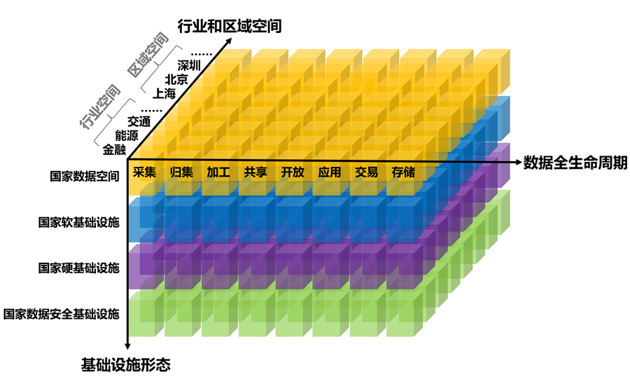 縱向上從頂?shù)降追謩e是國家數(shù)據(jù)空間、國家軟基礎(chǔ)設(shè)施、國家硬基礎(chǔ)設(shè)施、國家數(shù)據(jù)安全基礎(chǔ)設(shè)施等四層架構(gòu)。