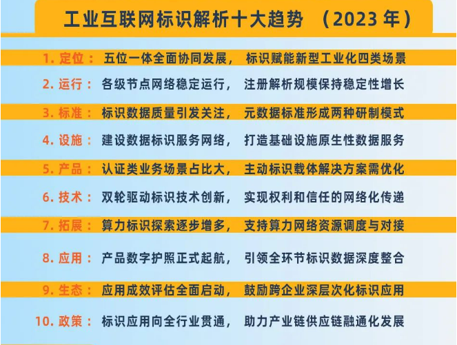工業互聯網標識解析十大趨勢是標識產業每年的風向標。11月14日,在2023年工業互聯網標識大會(江蘇)上,中國信通院發布了工業互聯網標識解析十大趨勢(2023年)。該趨勢從標識解析體系的定位、運行、標準、設施、產品、技術、拓展、應用、生態和政策這十個角度,關注已在產業鏈上下游形成強大生態的技術,著眼于前沿技術的探索與實踐驗證,以洞察標識解析技術在新型工業化中的角色轉換、產業創新和應用場景的演變。