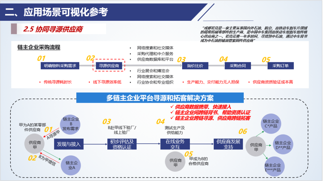 以上針對供應商全生命周期管理的“客戶旅程圖”框架強調了從尋源到長期合作的完整客戶旅程,通過提供高效的在線業務交互工具、供應商發展支持、以及跨行業拓展的增信和背書,鏈主企業可以吸引并維護中小企業供應商,同時提升自己的供應鏈競爭力和創新能力。