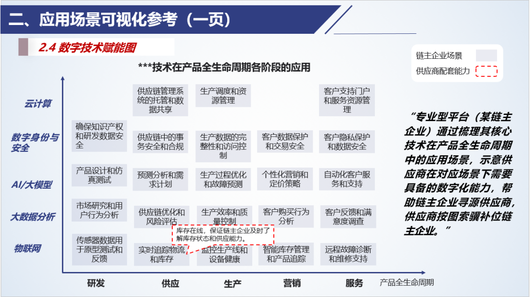 例如,橫軸表示產品生命周期各階段(如研發、供應、生產、銷售、服務),縱軸表示應用的數字技術(如物聯網、大數據分析、AI/大模型、數字身份與安全、云計算),在坐標點處通過應用場景(列表)展示不同技術在產品生命周期各階段的應用。適用于技術專業平臺向制造企業展示賦能能力,制造企業從產品全生命周期、企業資產管理等業務維度規劃統籌數字化轉型,鏈主企業基于應用場景規劃制定供應商的數字化能力標準。