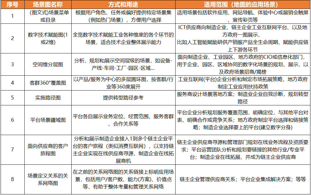 應用場景地圖適用于產業鏈圖譜不能覆蓋的細分場景,特別是在創新和技術應用方面;尤其適用于平臺明確定位、實現差異化競爭、以及平臺間互聯互通和合作。具體形式包括:技術賦能制造或供應鏈的二維圖、從設備/產線到全國布局的空間維分層圖、展示服務范圍和能力邊界的平臺場景疆域圖、描繪制造企業成為鏈主企業的供應商的客戶旅程圖、等等。應用場景地圖的特點和優點在于可提供全景式展示,可針對特定客戶群體的需求定制化,可靈活適用于各類應用領域,可根據市場和技術變化進行迭代更新。