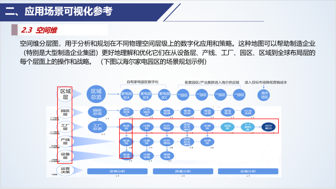 空間維分層圖,即空間維度的應用場景地圖,用于分析和規劃在不同物理空間層級上的數字化應用和策略。這種地圖可以幫助制造企業(特別是大型制造企業集團)更好地理解和優化它們在從設備層、產線、工廠、園區、區域到全球布局層的每個層面上的操作和戰略。