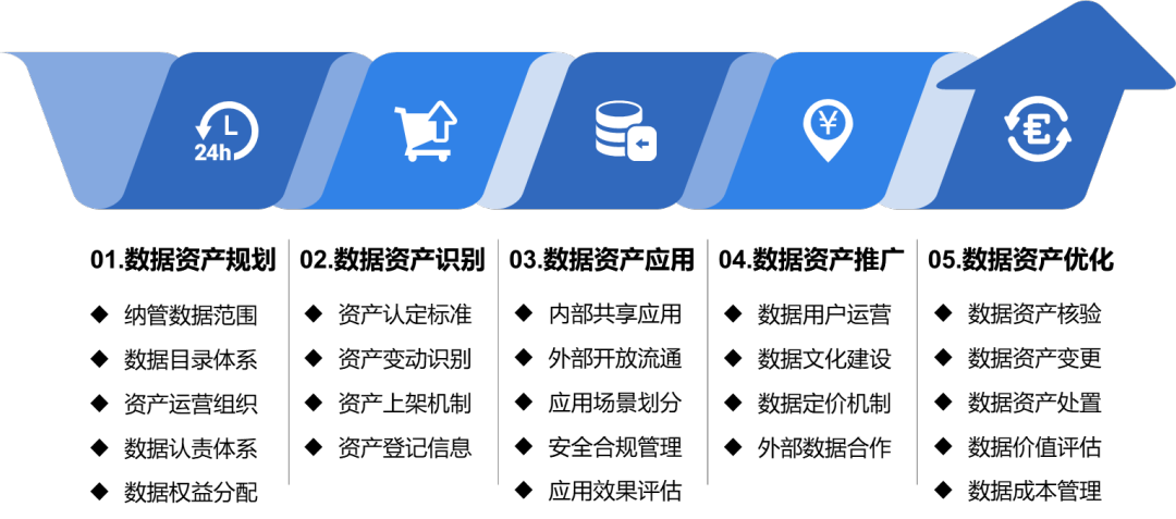 通過調(diào)研和評估觀察,我們總結(jié)出數(shù)據(jù)資產(chǎn)全運營“五步法”:數(shù)據(jù)資產(chǎn)規(guī)劃、數(shù)據(jù)資產(chǎn)識別、數(shù)據(jù)資產(chǎn)應(yīng)用、數(shù)據(jù)資產(chǎn)推廣、數(shù)據(jù)資產(chǎn)優(yōu)化。