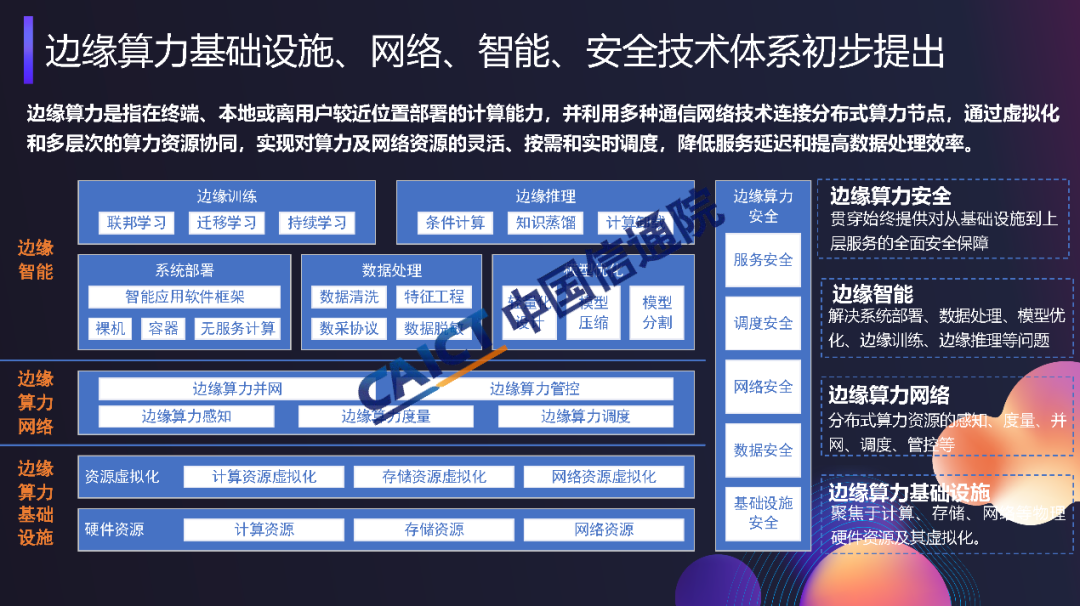 作為業(yè)界首個(gè)以邊緣算力為主題的研究報(bào)告,《邊緣算力藍(lán)皮書》系統(tǒng)闡述了邊緣算力整體發(fā)展態(tài)勢,凝練了邊緣算力資源異構(gòu)、網(wǎng)絡(luò)異構(gòu)、泛在分布、低時(shí)延、低成本、高隱私的六大關(guān)鍵特征;重點(diǎn)總結(jié)了邊緣算力基礎(chǔ)設(shè)施、邊緣算力網(wǎng)絡(luò)、邊緣智能以及邊緣算力安全四大關(guān)鍵技術(shù)方向;詳細(xì)梳理了邊緣算力在工業(yè)互聯(lián)網(wǎng)、智慧社區(qū)、軌道交通等垂直領(lǐng)域的應(yīng)用模式;提出了完善標(biāo)準(zhǔn)體系、加強(qiáng)基礎(chǔ)設(shè)施建設(shè)、推動邊緣算力共享等發(fā)展建議,為推動邊緣算力應(yīng)用落地提供理論支撐及實(shí)踐參考。