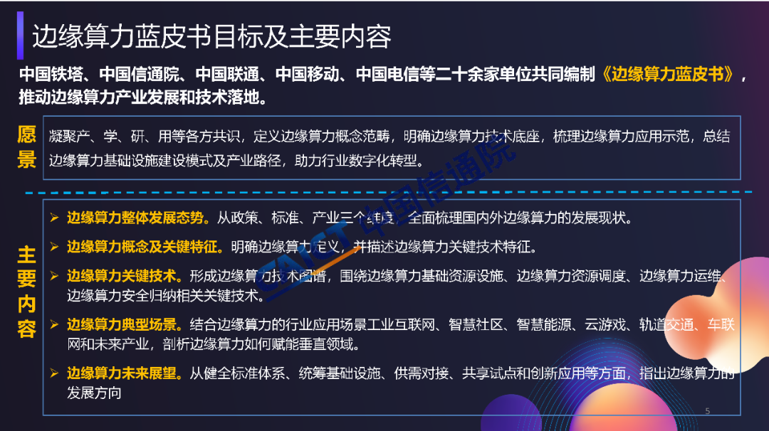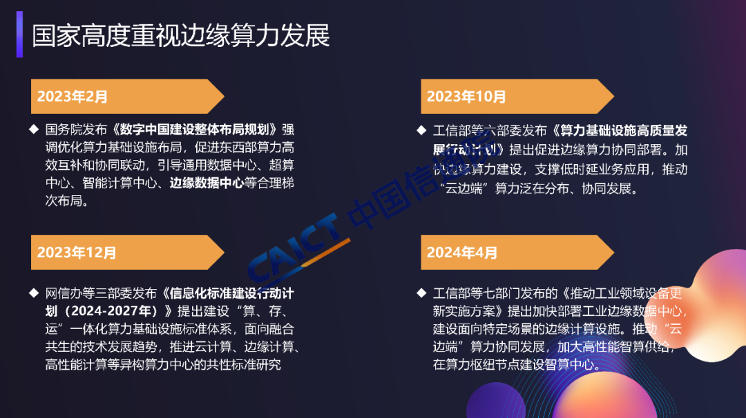 工信部等六部委聯(lián)合發(fā)布《算力基礎(chǔ)設(shè)施高質(zhì)量發(fā)展行動計(jì)劃》,明確提出促進(jìn)邊緣算力協(xié)同部署,加快邊緣算力建設(shè),支撐工業(yè)制造、金融交易、智能電網(wǎng)、云游戲等低時(shí)延業(yè)務(wù)應(yīng)用,推動“云邊端”算力泛在分布、協(xié)同發(fā)展。中國鐵塔、中國信通院、中國聯(lián)通、中國移動等單位共同啟動邊緣算力研究項(xiàng)目,并形成了《邊緣算力藍(lán)皮書》,也期待與行業(yè)內(nèi)合作伙伴共同合作,持續(xù)推動邊緣算力技術(shù)體系構(gòu)建及產(chǎn)業(yè)生態(tài)發(fā)展。